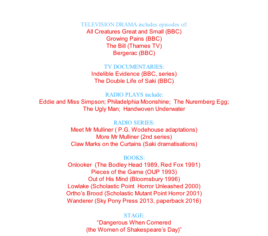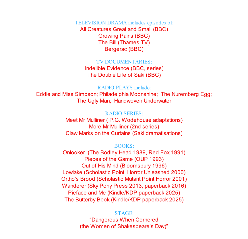 A lot of the theatre component of my original acting career can be found at Theatricalia. In terms of TV appearances, there weren’t that many. However, I did turn down quite a lot of jobs – in error, I now think. Throughout my career I always said I turned down more parts than I took on, because they weren’t good enough – but then when I needed the money I did anything that came my way… Not the cleverest way to develop a career. By the end of 1979 I was out of love with acting and gave up theatre work, though up until 1984 I took on some small/any old TV parts when they could be fitted in. Thereafter, for 20 years I rejected the occasional offers of acting work that came along until, finally, in 2005, the producer Bernard Krichefski offered Jo and me those husband and wife parts in an episode of ‘My Parents Are Aliens’.