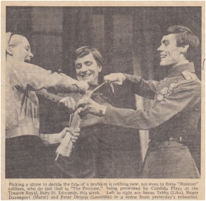 Left to right, Susan Tebbs, Peter Dennis and RD in “The Promise”, Theatre Royal, Bury St Edmunds 1969.