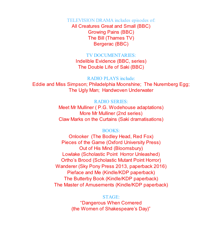 A lot of the theatre component of my original acting career can be found at Theatricalia. In terms of TV appearances, there weren’t that many. However, I did turn down quite a lot of jobs – in error, I now think. Throughout my career I always said I turned down more parts than I took on, because they weren’t good enough – but then when I needed the money I did anything that came my way… Not the cleverest way to develop a career. By the end of 1979 I was out of love with acting and gave up theatre work, though up until 1984 I took on some small/any old TV parts when they could be fitted in. Thereafter, for 20 years I rejected the occasional offers of acting work that came along until, finally, in 2005, the producer Bernard Krichefski offered Jo and me those husband and wife parts in an episode of ‘My Parents Are Aliens’.